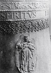 - Dzwon z 1618 roku waży 390 kg. Jego średnica dolna wynosi 80 cm, natomiast wysokość bez korony 105 cm. Koronę zdobią na kabłąkach główki męskie. Na pozostałe dekoracje składają się: kilka półwałków i perełkowań okalających dzwon, w tym wydzielających pola na napisy. Ponadto fryzy: groteskowy z motywem gryfa oraz arkadowy z motywami roślinnymi i kwiatonami w punktach powiązania. Na płaszczu znajduje się też plakieta z wizerunkiem Marii Apokaliptycznej. Umieszczono także inskrypcje w języku łacińskim zapisane pismem kapitałowym:
