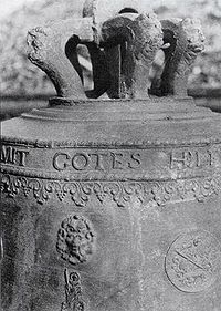 - Dzwon z około 1604 roku waży 238 kg. Jego ton muzyczny to fis’-1. Średnica dolna wynosi 74 cm, natomiast wysokość bez korony 82 cm. Sama korona mierzy 21 cm i zdobią ją na kabłąkach maszkarony. Na pozostałe zdobienia składają się: dwa półwałki na czapie, ornament z zaplecionej wstęgi z perełkowaniemwW górnej części płaszcza, zamykający inskrypcję w języku niemieckim: MIT GOTES HILF GOS MICH MICHELL DORNMAN ZV ELLBING 1694. Na płaszczu dzwonu umieszczono ponadto plakiety przedstawiające głowę lwa i wizerunkami św. Jerzego i św. Katarzyny.