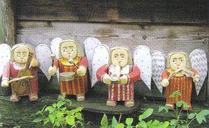 Ewa i Tadeusz Maculewiczowie – rzeźby w drewnie „Anielska orkiestra”, Źródło: [Beba, Bożena, Współczesna sztuka ludowa na Warmii i Mazurach, Olsztyn, Ośrodek Badań Naukowych im. Wojciecha Kętrzyńskiego, 2008.