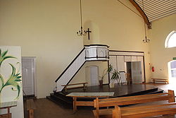Budowla o zwartej bryle została wzniesiona z mocno wypalonej, ciemnoczerwonej cegły, na rzucie wydłużonego prostokąta. Złożona jest z jednoprzestrzennej części kościelnej zajmującej dwie trzecie wielkości oraz dwudzielnej części mieszkalnej. Elewacje ozdobiono skromnym detalem neogotyckim, blendami i fryzem ząbkowym. W ścianach umieszczono ostrołukowe i prostokątne okna oraz regularnie rozmieszczone szkarpy. W fasadzie, udekorowanej wydłużonymi blendami, znajduje się kruchta otwierająca się arkadą, po bokach ujętą narożnymi szkarpami. W bocznych ściankach szkarp znajdują się granitowe tablice z inskrypcjami. Wnętrze zostało skromnie wyposażone, z emporą w części zachodniej oraz z amboną dla kaznodziei w części wschodniej. Przed amboną ustawiono basen chrzcielny ze schodami oraz osobnymi wyjściami dla kobiet i mężczyzn.
