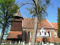 Jest to kościół murowany z cegły z użyciem kamienia, nie otynkowany. Posiada skromny detal barokowy, jednakże w ogólnym wyrazie wykazuje cechy budowli średniowiecznej. Posiada wyodrębnione prezbiterium, węższe od nawy głównej. Bryłę kościoła oszkarpowało. Szczyty nawy posiadają barokowe, miękkie kształty i ozdobione są blendami oraz kolistymi oknami. Od zachodu znajduje się drewniana wieża o bogatym detalu (m.in. półkoliście zamknięte wejście z tzw. mieczami), którą wieńczy ośmioboczna izbica nakryta gontową iglicą. Wnętrze nakryto drewnianym pozornym sklepieniem kolebkowym z lunetami.