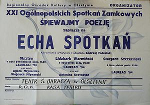 [[Image:poezja21_zaproszenie1.jpg|thumb|right|200px|Zaproszenie na koncerty XXI Ogólnopolskich Spotkań Zamkowych <br>Źródło: zbiory WBP w Olsztynie]] | [[Image:poezja21_zaproszenie1.jpg|thumb|right|200px|Zaproszenie na koncerty XXI Ogólnopolskich Spotkań Zamkowych <br>Źródło: zbiory WBP w Olsztynie]] | ||