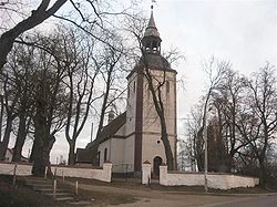 Wieś otrzymała przywilej lokacyjny w 1332 roku z rąk biskupa Henryka Wogenapa, który postanowił wybudować tu kościół. Budowa świątyni przypadła na drugą połowę XIV wieku. Pierwsza wzmianka o miejscowym proboszczu Janie Wilde pochodzi z 1481 roku. Obecna budowla powstała w latach 1786-1787, a jej konsekrację przeprowadził w 1789 roku biskup Ignacy Krasicki, ku czci św. Jana Chrzciciela i św. Apolonii. W latach 1919-1921 kościół został powiększony przez dobudowanie prezbiterium i zakrystii.
