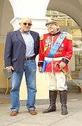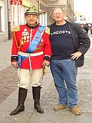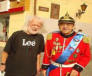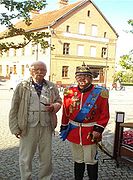 Andrzej Cieślak z Walerianem Ostrowskim - olsztyńskim piosenkarzem i bardem ulicy, laureatem wielu konkursów i festiwali piosenkarskich. Zdjęcie wykonano na tle Wysokiej Bramy 11 sierpnia 2014 r.