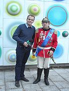 Andrzej Cieślak z Krzysztofem Hołowczycem międzynarodowym mistrzem sportów samochodowych na Starym Mieście w Olsztynie, 20 sierpnia 2014 r.