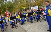 Andrzej Cieślak z Orkiestrą Dętą Uniwersytetu Warmińsko-Mazurskiego pod dyrekcją Cezarego Rzący na uroczystym otwarciu Muzeum Nowoczesności w Olsztynie, 14 października 2014 r.