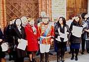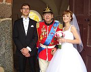 Andrzej Cieślak na dziedzińcu Olsztyńskiego Zamku z nowożeńcami spod Szczytna - Andżeliką i Arkiem, 14 października 2014 r.