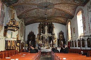W kościele znajduje się ołtarz główny z 1726 roku, wykonany w warsztacie Krzysztofa Peuckera w Reszlu. Ołtarze boczne, ambona i zagroda chrzcielna (baptysterium) są barokowe. W zwieńczeniu baptysterium umieszczono późnogotycką rzeźbioną grupę św. Anny Samotrzeć z początku XVI wieku.