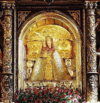 Perełką ołtarza głównego Bazyliki, wykonanego ok. 1630 r. jest umieszczona tam cudowna figura Matki Boskiej Łąkowskiej z 1402 roku , wysoka na 100 cm. Matka Boża na prawej ręce trzyma Dzieciątko, z twarzą zwróconą ku sobie, które tuli się w Jej ramionach, w lewej zaś Madonna trzyma berło. W kościele znajduje się też kilka bardzo cennych rzeźb: figura Madonny Tronującej z Dzieciątkiem z 1390 roku oraz rzeźba grupowa przedstawiająca jedną ze stacji Drogi Krzyżowej - Dźwiganie Krzyża z XV wieku.