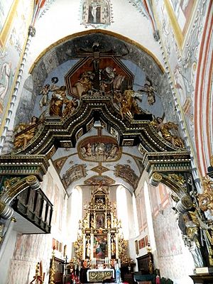 W wnętrzu świątyni zachowały się ścienne malowidła z okresu średniowiecza i baroku, na ścianach prezbiterium nawie głównej i pod chórem muzycznym - to unikat w naszym regionie. Malowidła XVII - wieczne możemy zobaczyć na stropie w prezbiterium i ścianach nawy głównej. Jedna ze scen przedstawia oblężenia Nowego Miasta przez Szwedów w 1628 roku.